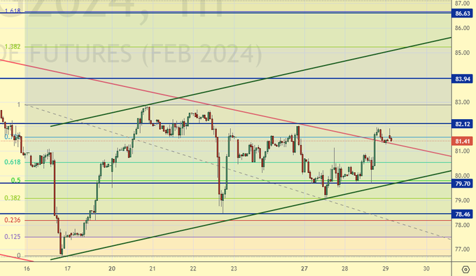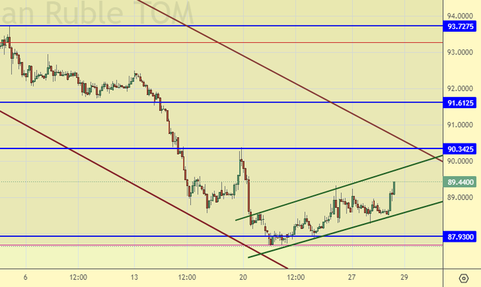 Район 90.00 наиболее вероятное сопротивление. Если рынок сможет преодолеть его сегодня, то нас ждет поход на 96.00. В противном случае можно рассчитывать на повторную попытку организовать глобальный ход на 80.00. Отметим, что траты на оборону и безопасность в размере 40% бюджета оптимизма не вызывают.