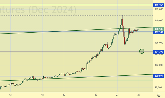 Технически мы очень красиво выставились для падения на 104500, чем можно воспользоваться. Да, скорее всего сделка будет убыточной, поэтому, много не ставим, но хорошее соотношение прибыль риск затягивает нас в неё.