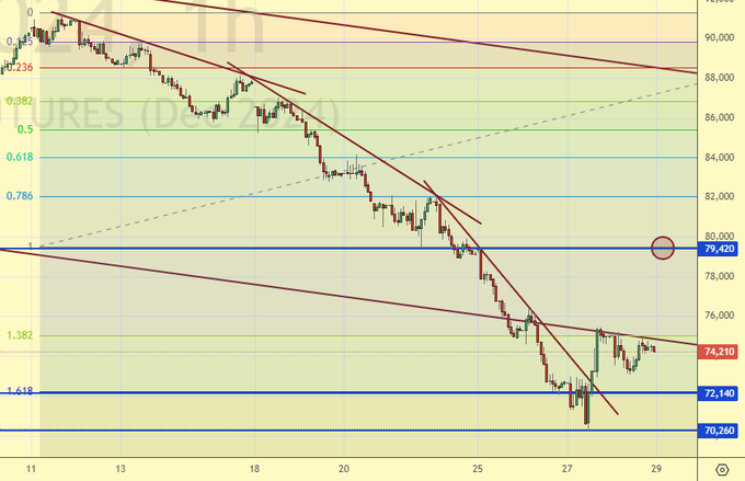 Продажа: сейчас (74210) и при касании 75000. Стоп: 75800. Цель: 60000. Считайте риски! Или при откате к 80000. Стоп: 81000. Цель: 60000.