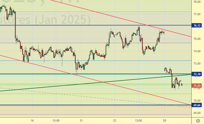 Азиаты, азиаты утром с воскресенья на понедельник оценили ущерб атаки на Иран близкий к нулевому и нарисовали нам гэп вниз по рынку. То есть: война – это мир. Так и должно быть? Здесь явно что-то не так. Уже создано мнение, что нефти будет много в 25-м году. И нам надо вроде как падать. А кто вам сказал, что её действительно будет много? Даже если встанет Китай, умереть-то он не умрет, если поглощал 1/10 добычи, будет поглощать 1/9, но он не исчезнет. Америка не разбурится за 25-й год с 13.5 до 15 млн. баррелей в день не сможет.