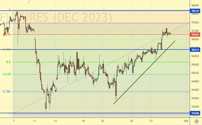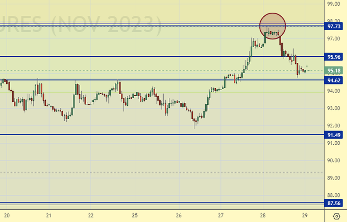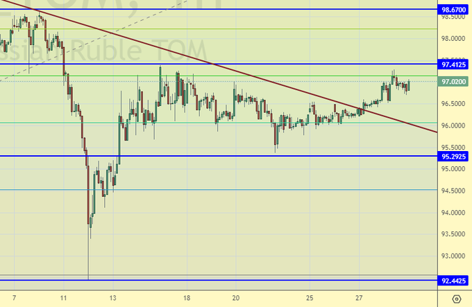 Продажа: нет. Кто в позиции от 97.00, держите стоп на 97.60. Цель: 90.00.