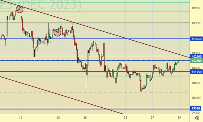 Продажа: нет. Кто в позиции от 105500, перенесите стоп на 103300. Цель: 93600.