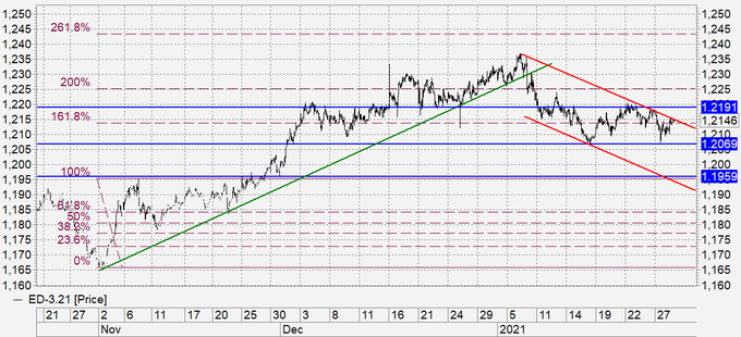 Евро пока держится. Быки пытаются создать поддержку в районе 1.2100 от которой затем можно будет оттолкнуться и пойти к 1.2400. Но, так как Европа не срывает все сроки вакцинации, всего 2 человека на 100, против 9 в США и Великобритании, ждать, что европейский рынок оживет быстрее островитян и США не приходится. Евро будет оставаться под давлением пандемии на пару месяцев больше чем Штаты.