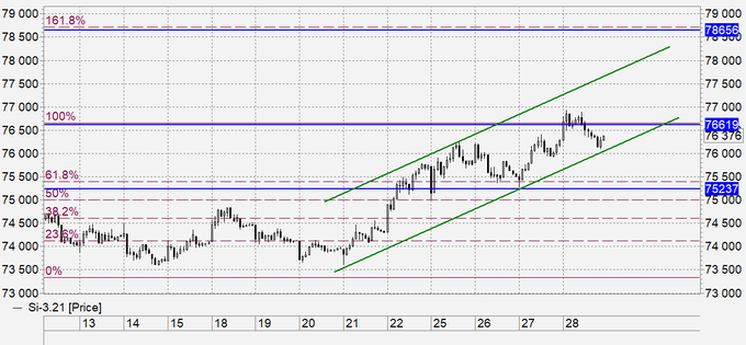 Видим небольшую коррекцию. Пара подошла к нижней границе растущего канала, где принято покупать. Что и рекомендуем сделать. Если сегодня нефть пойдет вниз, а все предпосылки к этому есть, то рубль способен отправится к 77.80.