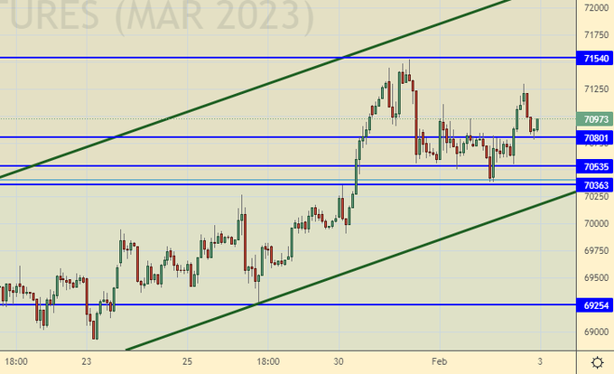 Не видим мы стремления поклонников рубля сломать бычий тренд по доллару. В текущей ситуации нас ждет тест сопротивления 71.27 и в том случае если оно будет взломано мы отправимся к 82.00. Пока народ осторожен. Если с эмбарго на нефть пока удается как-то справляться, то с эмбарго на нефтепродукты только предстоит столкнуться. Не исключено, что оно окажет более негативное влияние на доходы бюджета, чем эмбарго на нефть.
