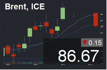 Цена в долларах за баррель. Для пересчета в доллары за тонну нефти марки Brent, необходимо цену умножить на 7,59.
