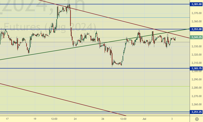Судя по всему, мы ждем данные по числу новых рабочих мест вне сельскохозяйственного сектора. Вряд ли увидим какие-то сильные движения до вечера пятницы. Если не будет сильного негатива, то доллар скорее окрепнет, чем ослабнет, поэтому золоту пока можно нарисовать перспективу вниз. Хотя бы до 2250.