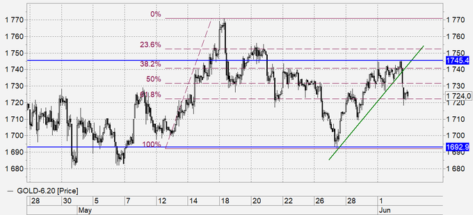 Ушли вниз от 1745. Ситуация может получить развитие в случае падения ниже 1700. В случае возврата к 1733 можно нарастить шорты. Снижение цен на металл можно объяснить только продажами из-за большой нужды. Неопределенность в экономике сохраняется.