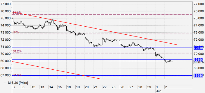 Продажа: нет. Кто в позиции от 70800, перенесите стоп на 69300. Цель: 67000.