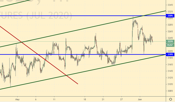 По теням свечей видим, что рынок встречают в области 505.0- 510.0. Ситуация остается под контролем быков, но, если цены уйдут ниже 500.0 быки разбегутся. Здесь можно покупать только основываясь на сезонности, в расчете на рост цен до середины лета. Впрочем, сценарий, когда цены простоят в диапазоне 500.0 – 520.0 несколько недель нельзя исключать. Всему виной хорошие виды на урожай.