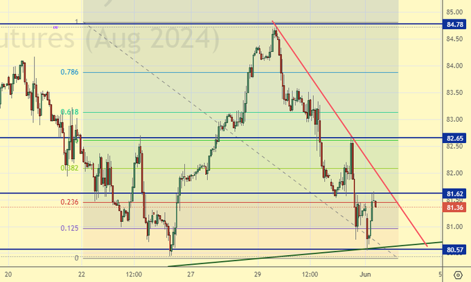 Прошло заседание ОПЕК+. Решено придерживаться договоренностей о сокращении добычи аж до конца 2025-го года. Видим, что реакция на эту новость у рынка бычья, но крайне сдержанная. При этом был еще и ход вниз в начале торгов. Теперь не стоит торопиться с покупками пока мы не вырастем выше 82.00. Продажи с текущих уровней воспринимаются как заниженные.