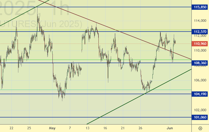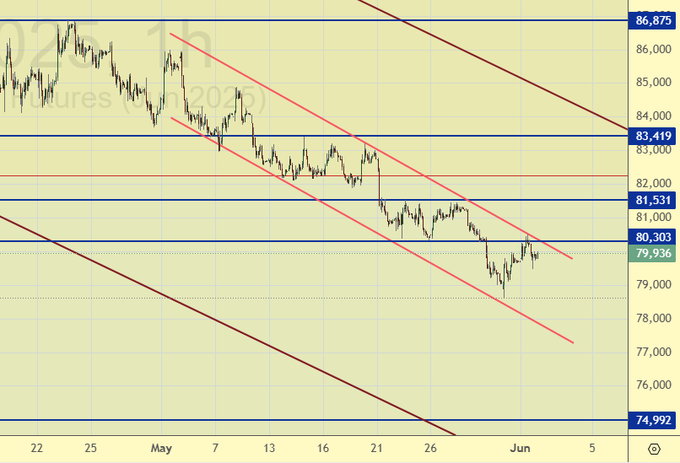 Продолжаем жить в узком агрессивном падающем канале. Торопиться тут с покупками смысла нет. Только после хода выше 81000 можно купить. Не забываем про заседание ЦБ РФ в пятницу.
