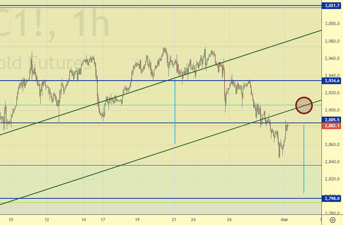 Кто уже в шортах может добавить от 2900. Также на этом уровне можно продать, если позиции нет. Пока, есть ощущение, что Европа хочет заморозить и погасить поставленную Москвой проблему «Украина». Откровенных ястребов там не так много, слишком сытая жизнь, но они есть. И если горячие головы возьмут верх, то путь будет только вверх. А пока можем рассчитывать на ход к 2800.