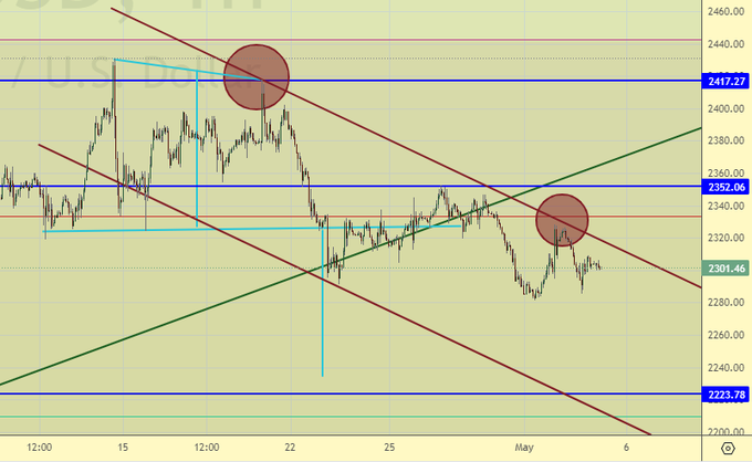 Продажа: нет. Кто в позиции от 2415 и 2336, перенесите стоп на 2351. Цель: 2100.
