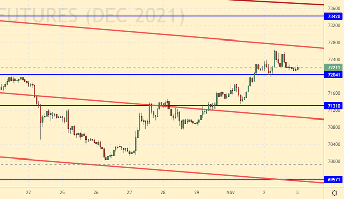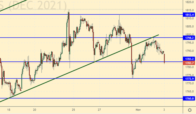 Видим, что утро среды, в день заседания ФРС, золото встречает красной часовой свечой Московской биржи. У доллара много поклонников и все они надеются, что всё в мире будет также, как и прежде, как при Билле Клинтоне: хорошее кино, модная одежда, крепкий доллар, рост комфорта и благополучия (это всё написано про США). Если Пауэлл будет мягок сегодня, то золото начнут подбирать от 1750. В противном случае нам стоит настроиться на откат к 1650.