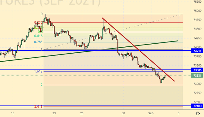 Продажа: при подъеме к 73800. Стоп: 74400. Цель: 68000?! Кто в позиции от 73800, держите стоп на 73300. Цель: 68000.