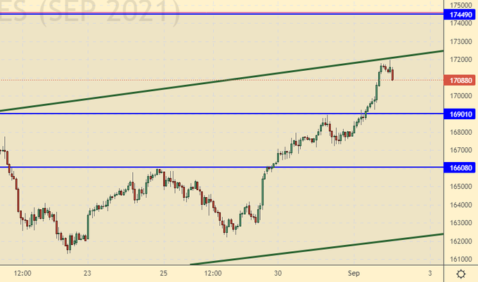 Укрепление рубля и хорошие данные Росстата по росту экономики России в первом полугодии на 4.8% поддержали рынок. Сегодня, если доллар продолжит падение, мы можем увидеть проход вверх к 174500, он напрашивается с точки зрения техники.