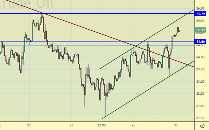 Пока имеет смысл ставить на падение, однако, в случае роста выше 86.00, придется отказаться от попыток войти в шорт.