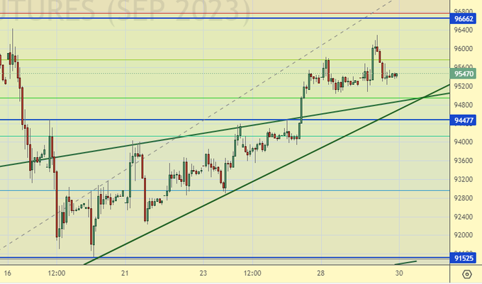 Продажа: если час закроется ниже 94300. Стоп: 95300. Цель: 87000.
