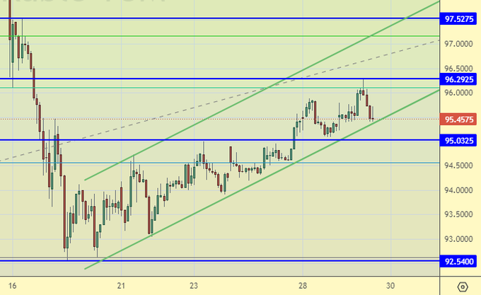 Продажа: если час закроется ниже 94.70. Стоп: 95.70. Цель: 87.00.