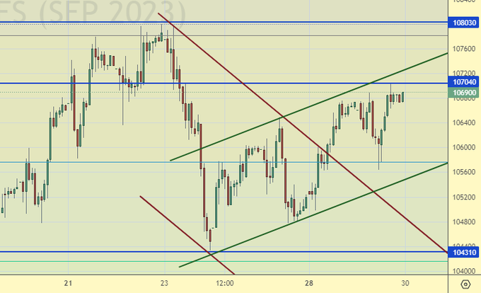 Рынок российских акций в целом пребывает в хорошем настроении. Индекс ММВБ на локальных максимумах, что предполагает продолжение роста. Разворота вниз по факту пока нет. На этом фоне и индекс РТС претендует на рост, тем более что по рублю остаются некоторые шансы на укрепление. Пока вне рынка.