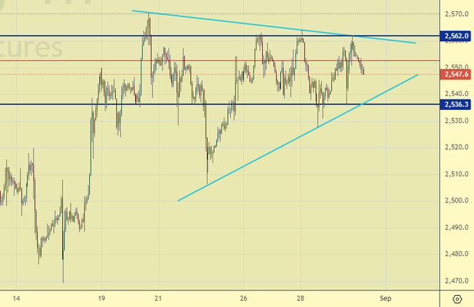 Быки планомерно готовят себе плацдарм для продолжения роста. В случае хода выше 2570 мы можем увидеть сильный рост. Продавцам надо уже сегодня что-то предлагать: ход ниже 2530 – это предмет для дискуссии, пока же мы вынуждены констатировать, что падения у нас нет.