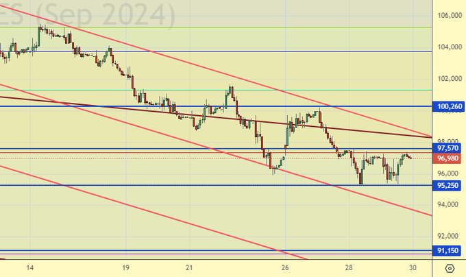 Остановились, что называется «посреди дороги». Что это такое 95250? Пока мы продолжим рассчитывать на падение. Оптимизм по Газпрому на фоне дивидендов выглядит наигранным. Прям вот взяли и заработали один триллион рублей прибыли?! Без Европы?! Чудно…