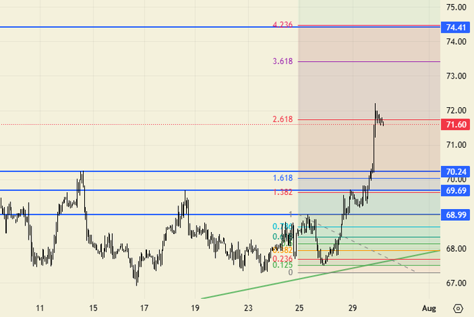 Покупка: при откате к 70.20. Стоп: 69.20. Цель: 80.00.