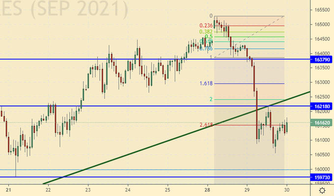 «Вряд ли на фоне перспектив увеличения ставки ЦБ РФ российский рынок акций будет продолжать рост», – сомневались мы вчера утром. День подтвердил наши опасения. В складывающихся обстоятельствах будем продавать при подъеме к 163000 с целями на 159600. Сегодня среда, день не самый продуктивный, а точнее, самый непродуктивный. Поэтому, откат вверх будет наиболее вероятным сценарием.