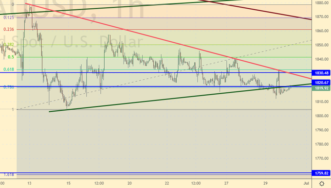 Видим, что продавцы контролируют рынок и не желают, чтобы цены поднялись выше линии сопротивления, а сейчас это район 1830. Если будет еще один удар вниз, то его будет достаточно для того, чтобы мы отправились к 1760. Пока имеет смысл держать шорты.