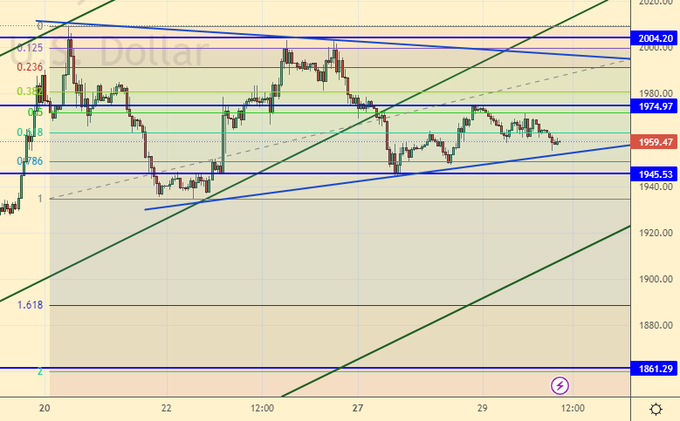 Консолидация на рынке продолжается. Некоторое преимущество есть у продавцов на данный момент, но в случае подъема выше 1980 картинка вновь станет смешанной. Ставка в США остается высокой. Весь сектор commodities будет под давлением из-за крепкого доллара.