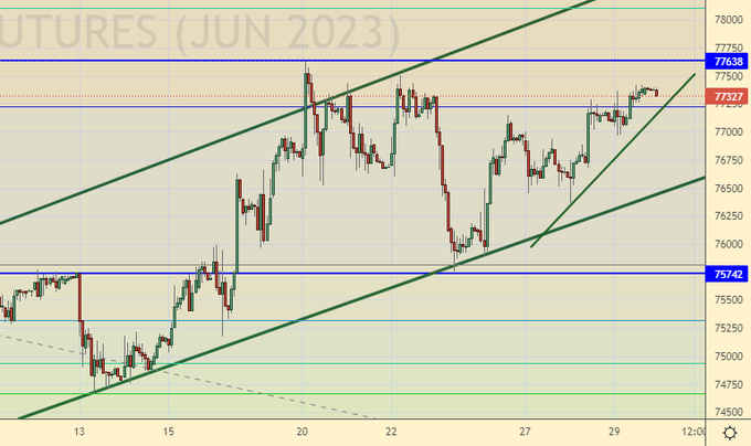 Покупка: нет. Кто в позиции от 75900 перенесите стоп на 76400. Цель: 79500.