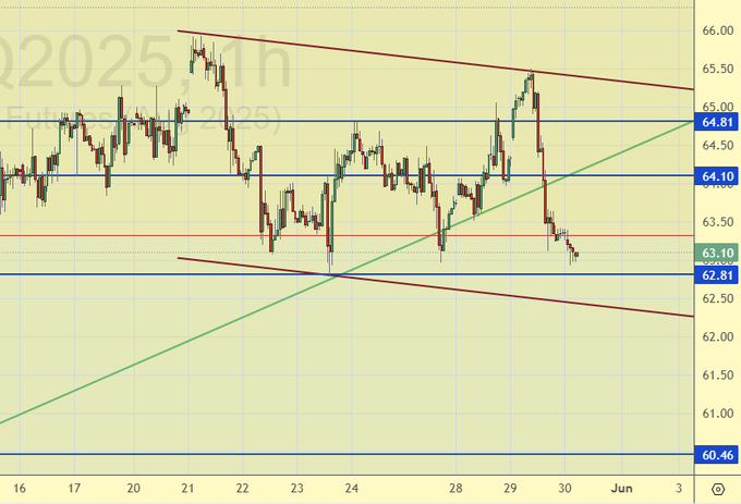 Продажа: при подходе к 64.00. Стоп: 65.70. Цель: 53.00.