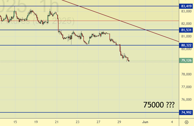 Ничего себе история. Продолжает рубль укрепляться, что может привести нас к 75000?! Пока признаков разворота нет. Снимем все рекомендации и будем просто любоваться процессом. Он не бесконечен. Но… пока мы идем вниз.