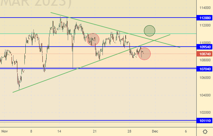 Вчера остановились в крайне опасном для быков месте. Движение ниже 108000 приведет к быстрому падению к 103000, причем никто не гарантирует, что на этом падение закончится. Траты на оборону и на поддержание жизни на новых территориях будут значительными. Бюджет будет, но он будет таков, что на всё не хватит.