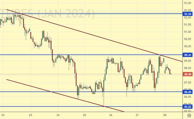 Вечером в пятницу цены дернулись вверх на новостях о входе ЦАХАЛ в Сектор Газа. Пока не подтверждается начало полномасштабной операции, поэтому мы не видим продолжения роста. Но оно будет, так как глобальный Юг может поставить перед Западом слишком дорогую задачку, решить которую США не смогут без серьезных экономических потерь.