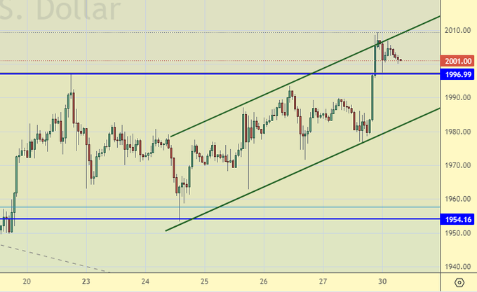 Покупка: кто в позиции от 2001, держите стоп на 1973. Цель: 2400. Или при подходе к 1920. Стоп: 1880. Цель: 2400.