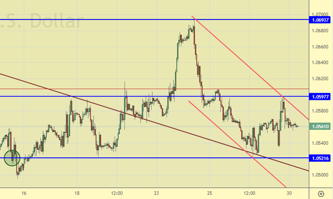 Продажа: нет. Кто в позиции от 1.0560, держите стоп на 1.0610. Цель: 1.0220.