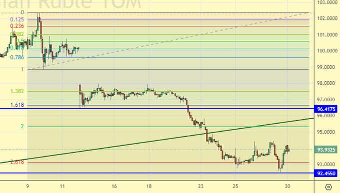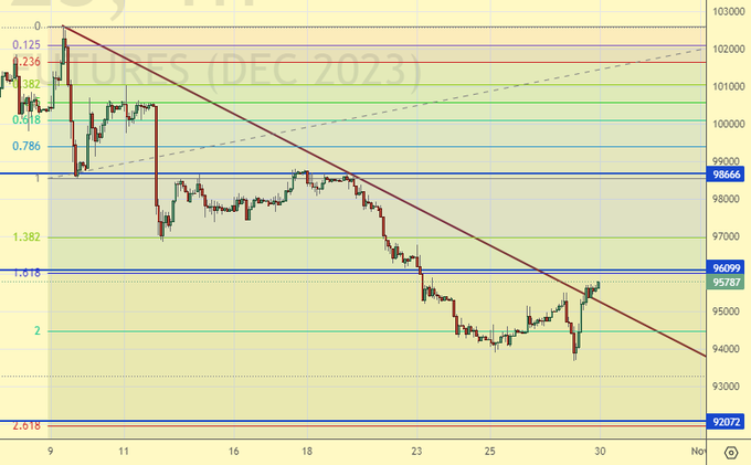 Продажа: при подходе к 96.00. Стоп: 97.00. Цель: 87.00.