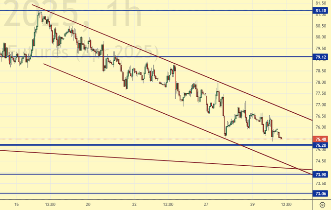 Покупка: сейчас (75.48) и при подходе к 74.20. Стоп: 73.60. Цель: 90.00. Считайте риски.