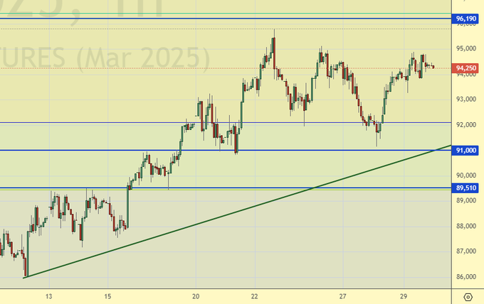 Не можем подняться выше 96000. На рынке много негатива, но ментально пробить торговцев уже невозможно. Должно произойти что-то такое, что затронет судьбу всего континента, причем разом. Чтобы это могло быть? В остальных случаях рынок все больше будет уходить от эмоций и заниматься цифрами и статистическими данными.