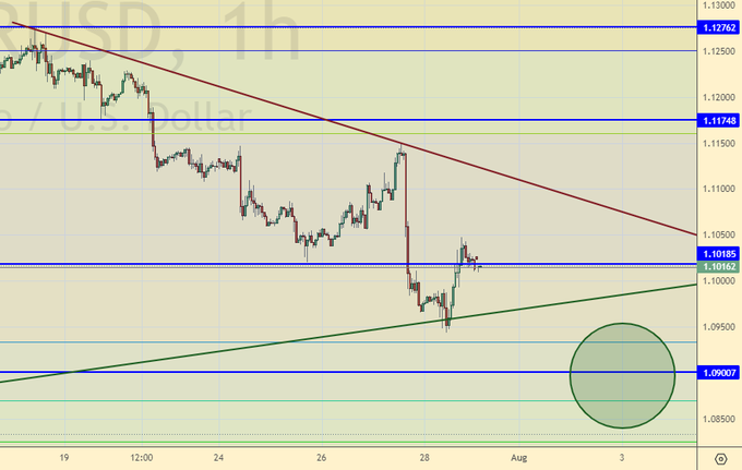 Для идеальной покупки хотелось бы увидеть спуск к 1.0930. Если его не будет, что придется покупать выше 1.1150, что не так привлекательно. Цель пока остается у нас наверху на 1.2000.