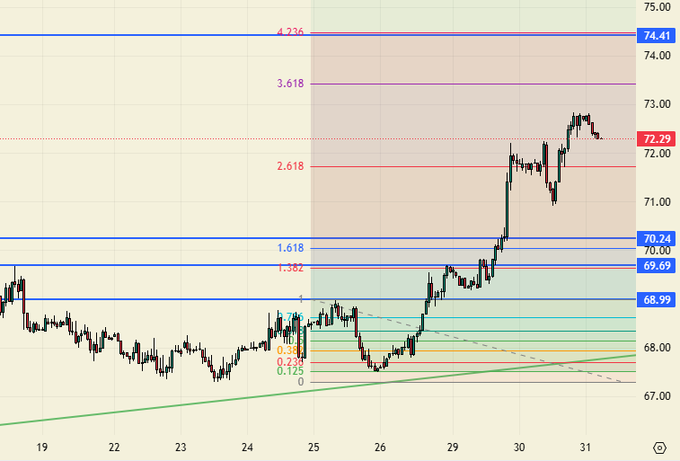 Покупка: при откате к 70.20. Стоп: 69.20. Цель: 80.00.