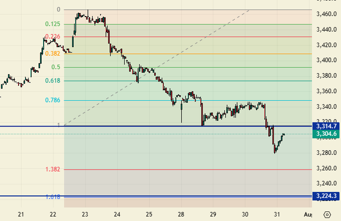 Сентябрьский фьючерс. ФРС оставила ставку без изменений, что дает повод медведям по золоту продолжать. Скорее всего мы увидим попытку пробиться ниже 3220, с целью на 3075.