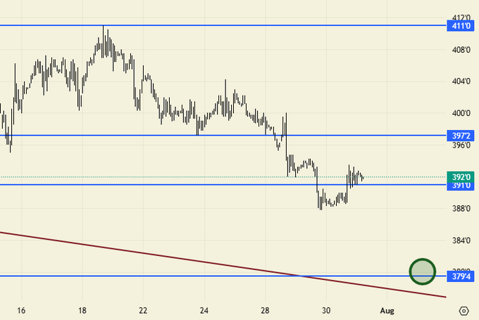 Продажа: нет. Кто в позиции от 3390, перенесите стоп на 3380. Цель: 3000 (2800).