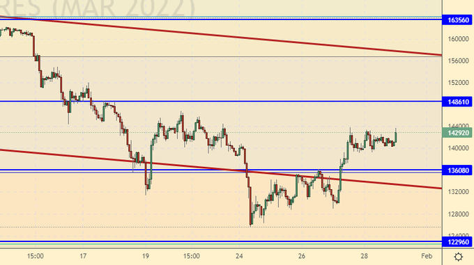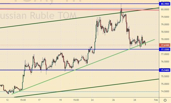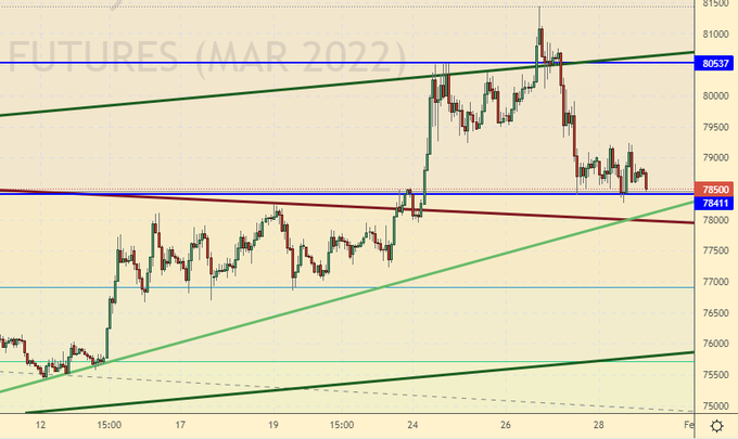 Нефть продолжает расти, что поддерживает текущее укрепление национальной валюты. В случае падения ниже 76.50 рубль может найти поклонников. Однако, мы ждем ответ Кремля на американский ответ, который был ответом на наш ультиматум. Пока ситуация не предполагает снижение напряженности даже несмотря на Олимпиаду, которая будет проходить в Китае с 4-го по 20-е февраля.
