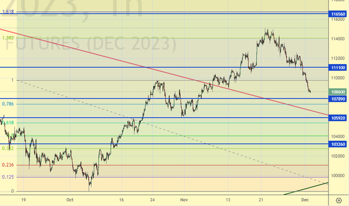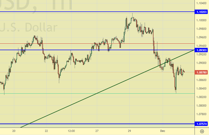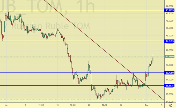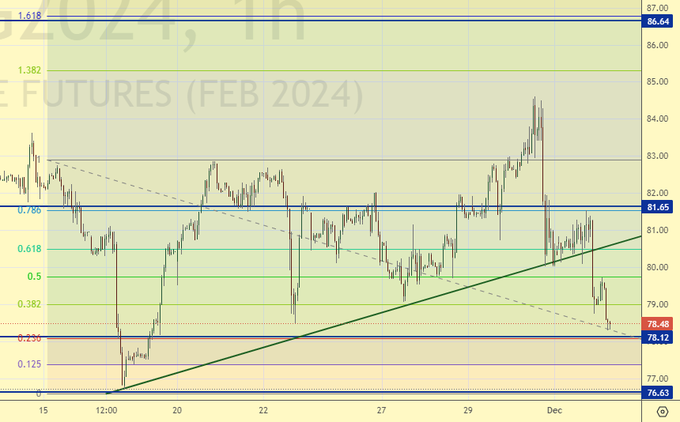 Равновесие с некоторым преимуществом быков за счет восходящего движения (см. «дневки»). Пока не так и азартно ставят на падение доллара перед заседанием ФРС 13-го декабря. А всё из-за разогнавшейся экономики США, которая не хочет останавливаться даже при ставке 5.5%.