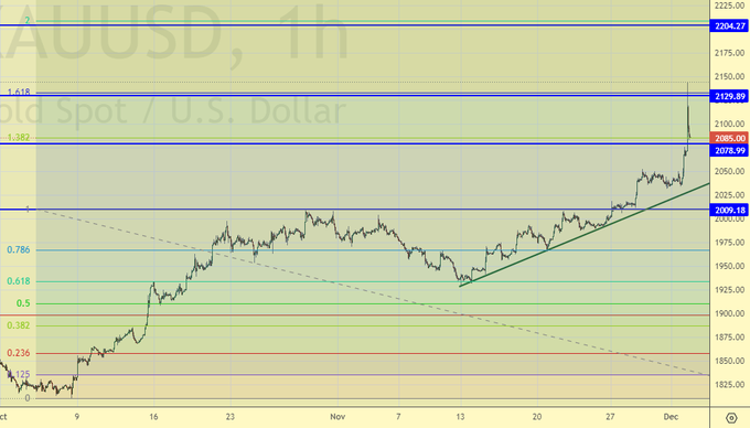Понедельник открылся продергиванием вверх к 2140. Это симптоматично. Рост цен стремится ускориться. Видим, что продавцы обнаружили себя только при подходе к 2150, и скорее всего выше тоже ничего нет. Возможно, до 2400 мы вообще не встретим какого-либо сопротивления. А нечего было печатать бумагу.