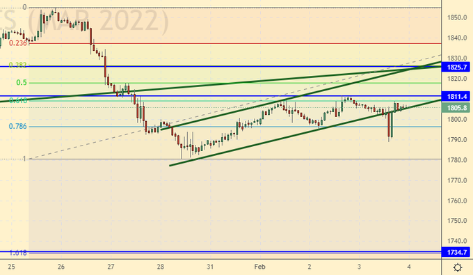 Продавцы вчера не смогли пробиться ниже 1790.0. Падающий индекс доллара стимулировал покупки на падении, что привело к возврату цен выше уровня 1800. На данный момент признаем ситуацию нейтральной. Не исключаем роста к 1825.