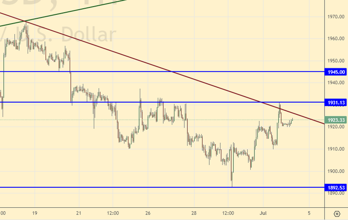 Если будет рост к 1950 можно продать. Рост рынка золота на фоне высокой ставки в США не выглядит очевидным. Будем смотреть вниз несмотря на то, что наш стоп на 1924 сработал. Надо искать новые возможности для входа в шорт.
